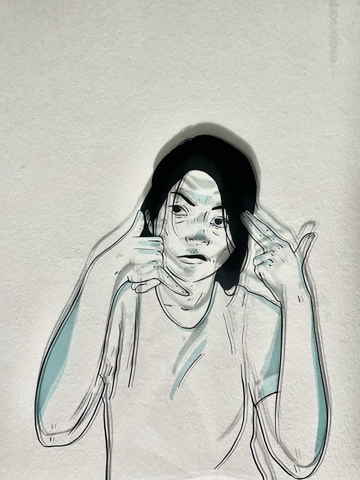 Ilustração de parede de pessoa com cabelo preto e camisa branca fazendo um gesto com as mãos