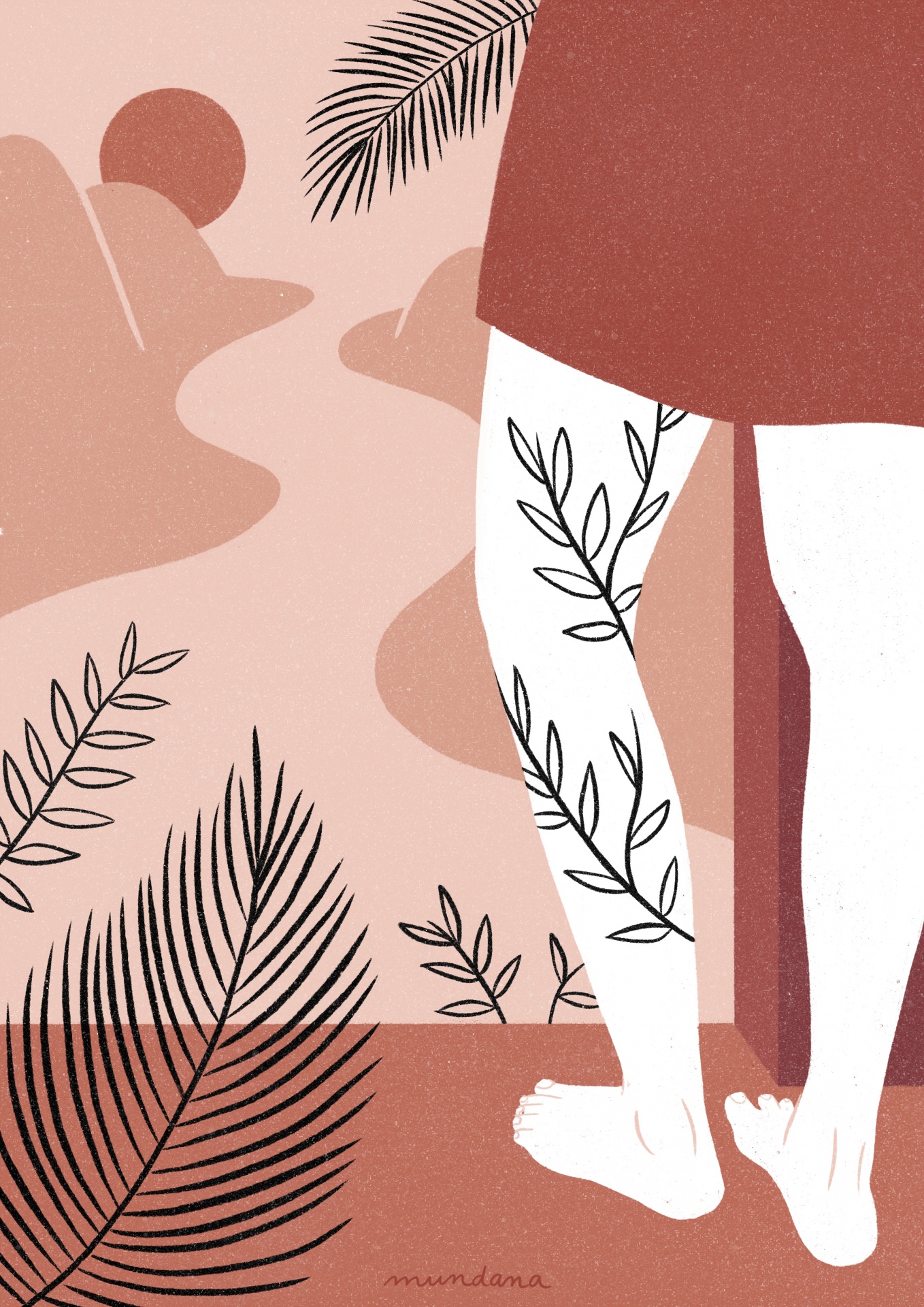 Ilustração de pernas com padrão de folhas e vestido terracota em fundo abstrato