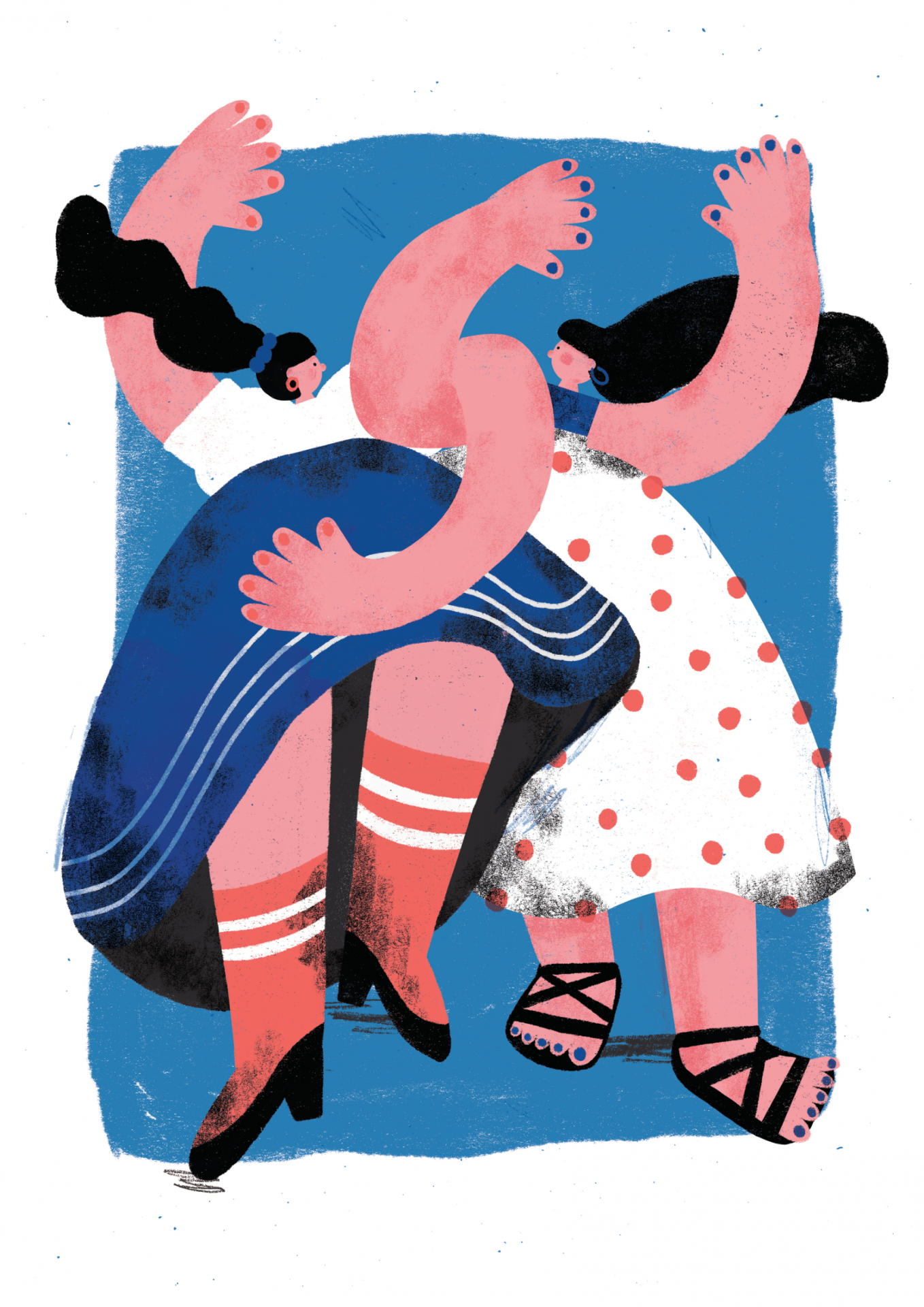 Ilustração de duas mulheres com roupas coloridas a dançar num fundo azul