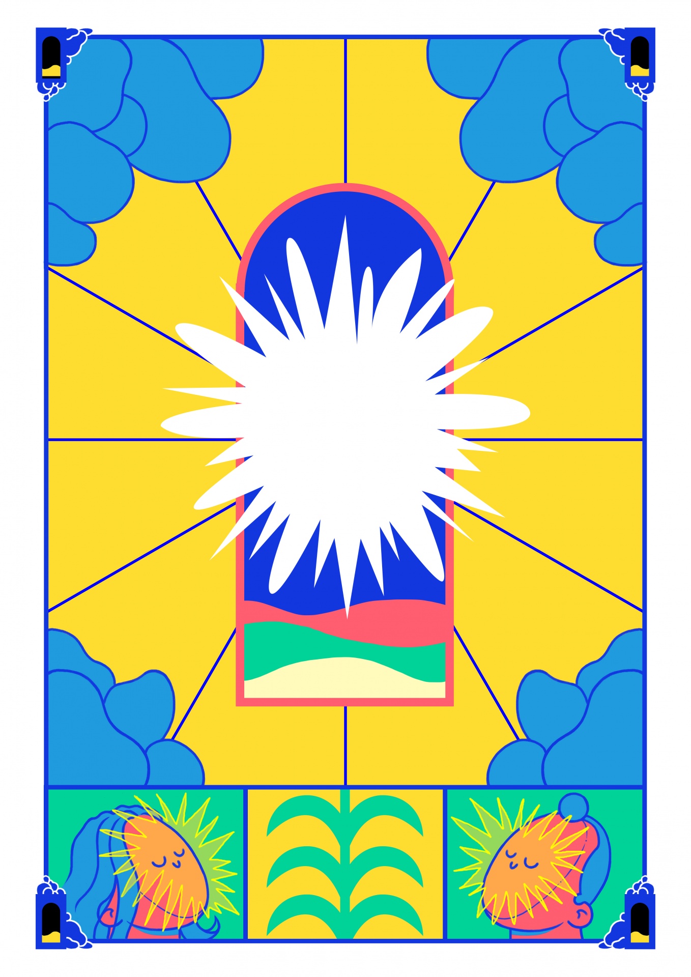• Ilustração colorida de formas geométricas e elementos florais estilizados em amarelo, azul, verde e vermelho