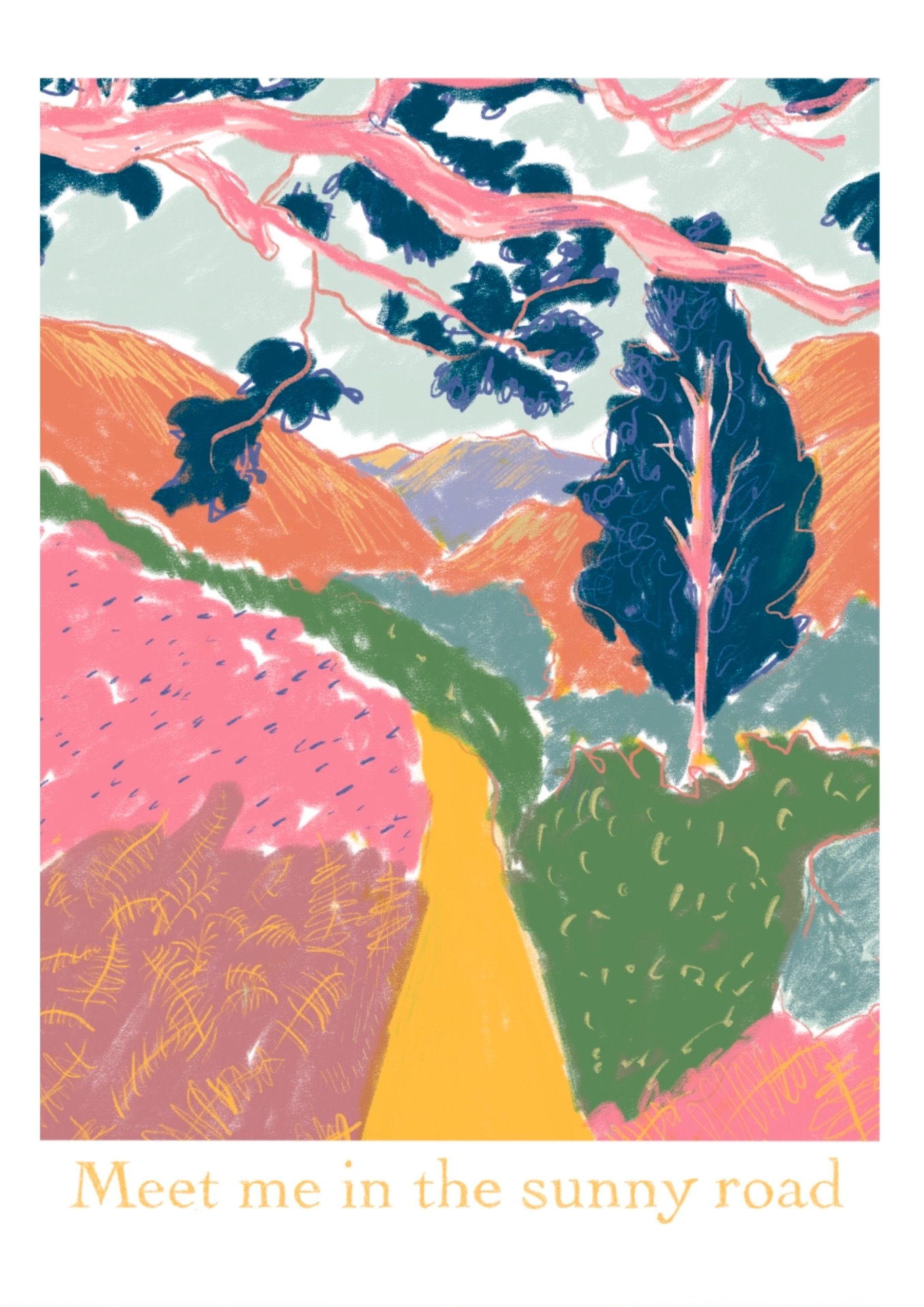 • Ilustração de estrada amarela com vegetação colorida e texto em inglês.