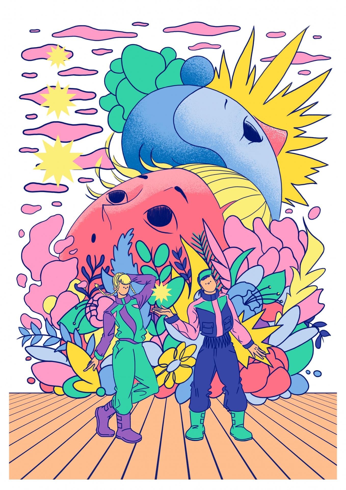 • Ilustração colorida com duas personagens e formas abstratas