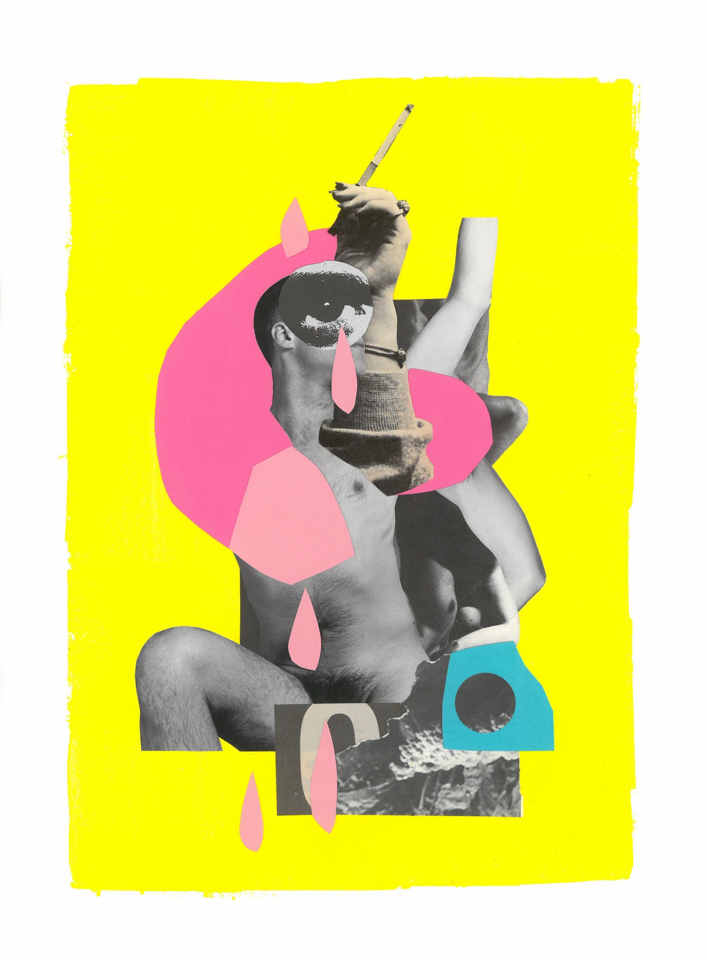 • Colagem artística com figura humana em preto e branco e formas coloridas sobre fundo amarelo