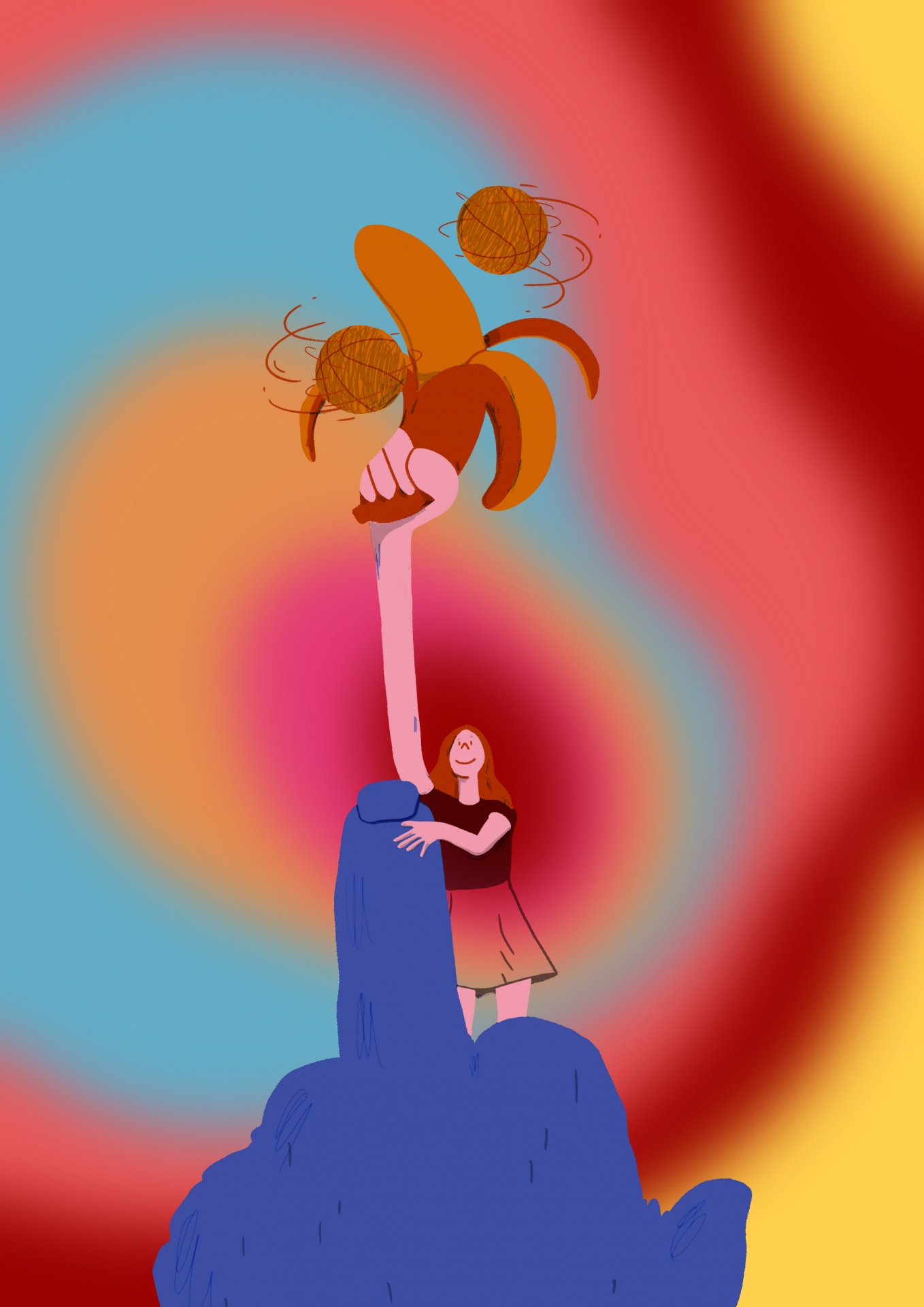 • Ilustração de uma figura humana abraçando um dedo azul que segura bananas animadas em fundo colorido.