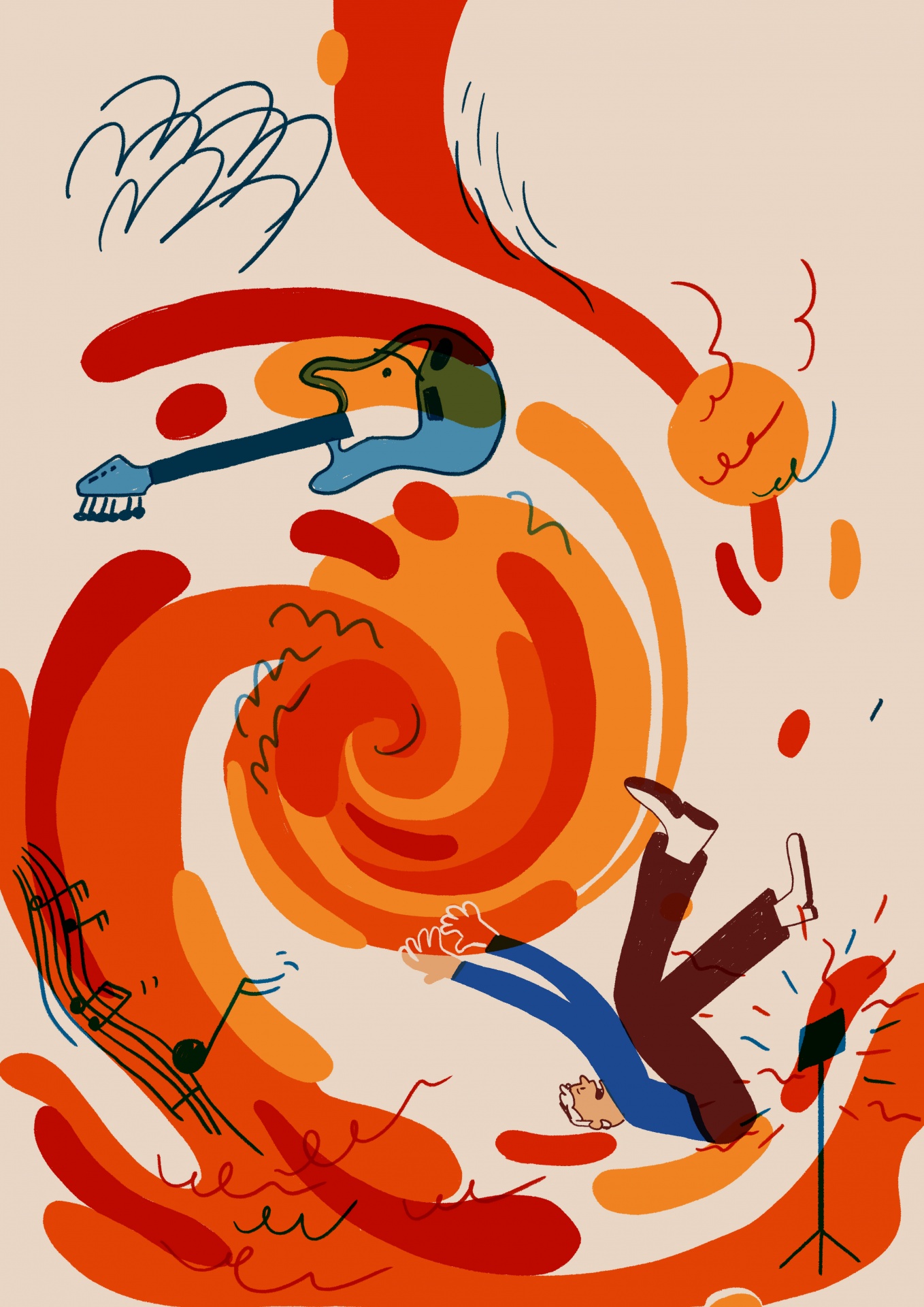 • Ilustração colorida com guitarra, notas musicais, homem e microfone em espiral laranja