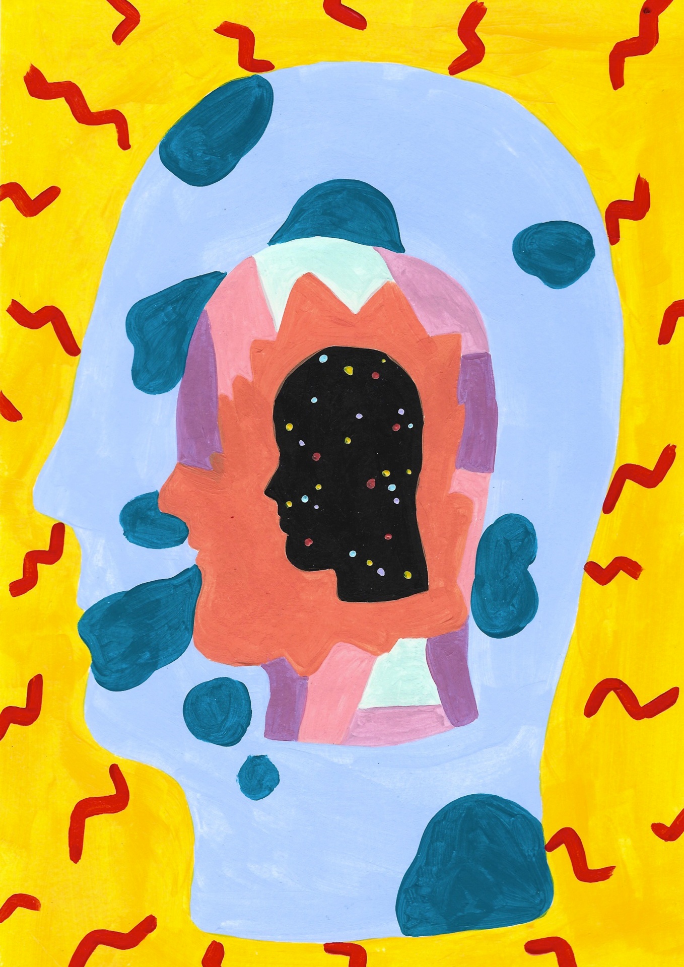 • Pintura abstrata com silhuetas de rosto e cores vibrantes em fundo amarelo.