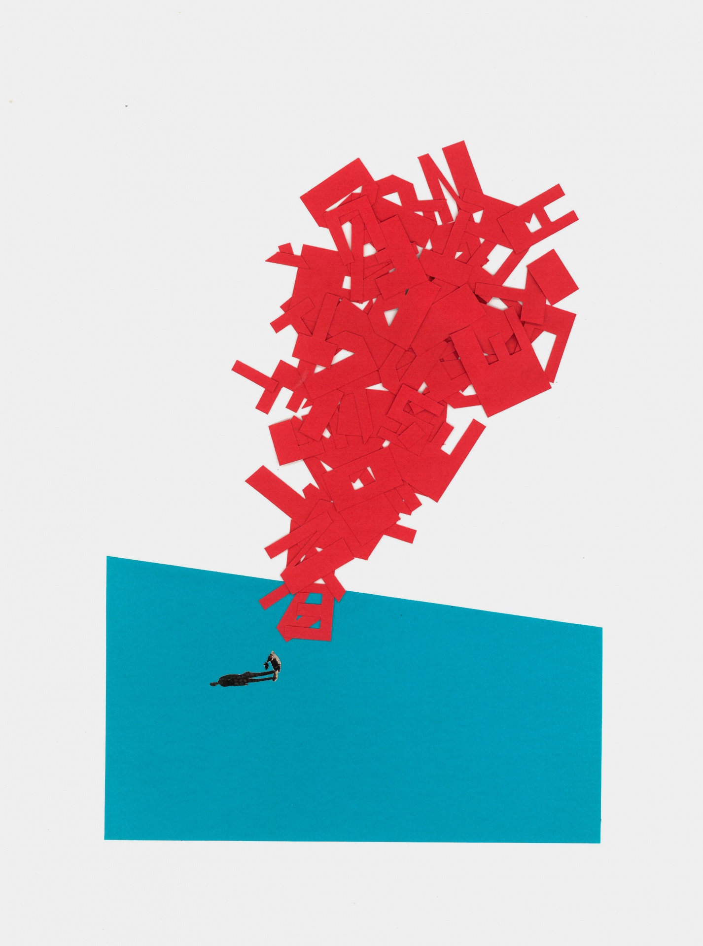 • Imagem artística com figura reclinada e nuvem vermelha de letras sobre forma azul