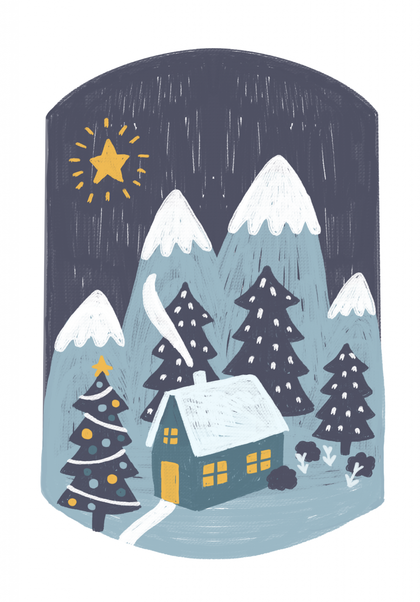 • Ilustração de casa de inverno com montanhas, árvores e estrela brilhante