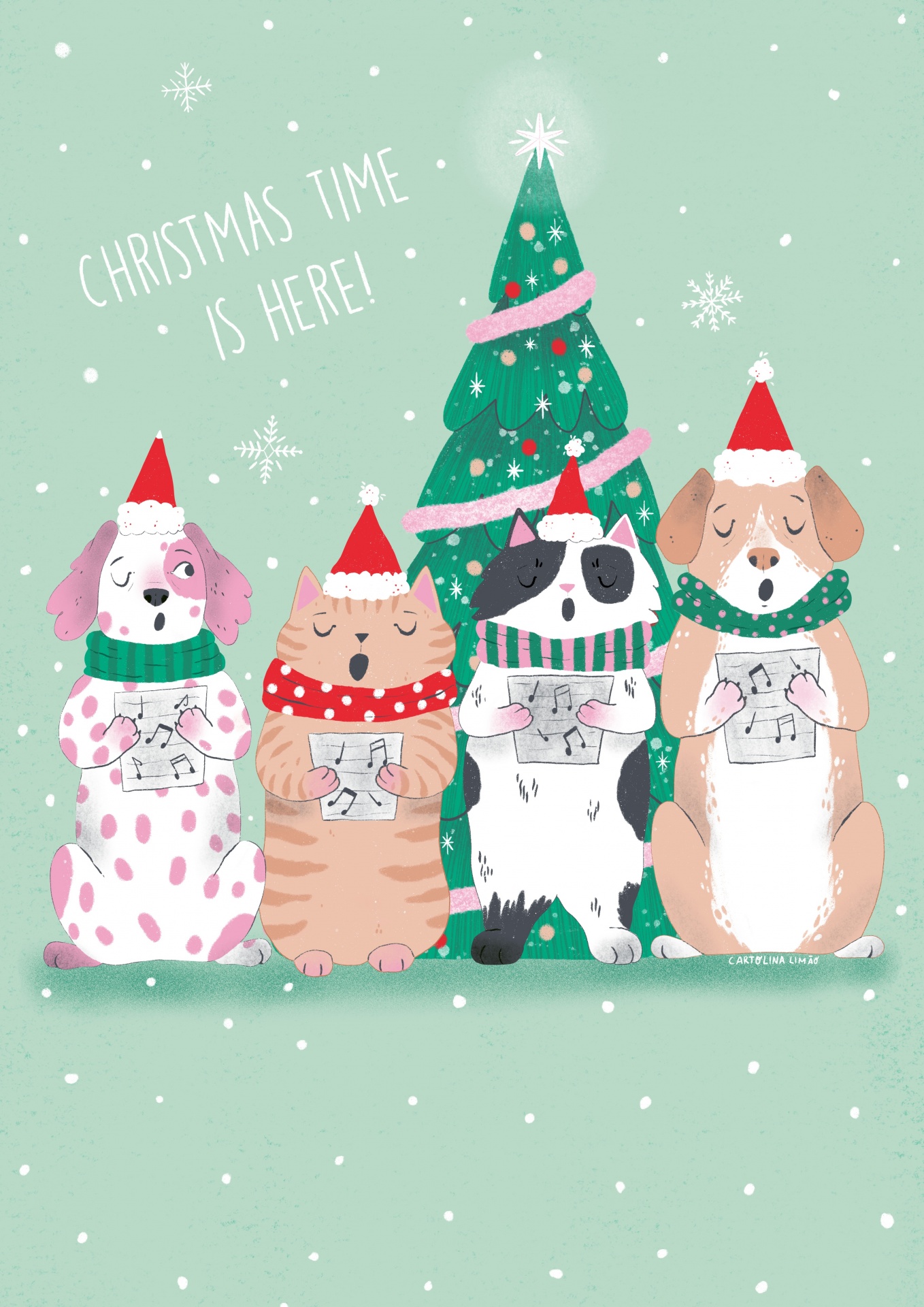 • Ilustração de animais a cantar de gorro vermelho e cachecol com árvore de Natal ao fundo