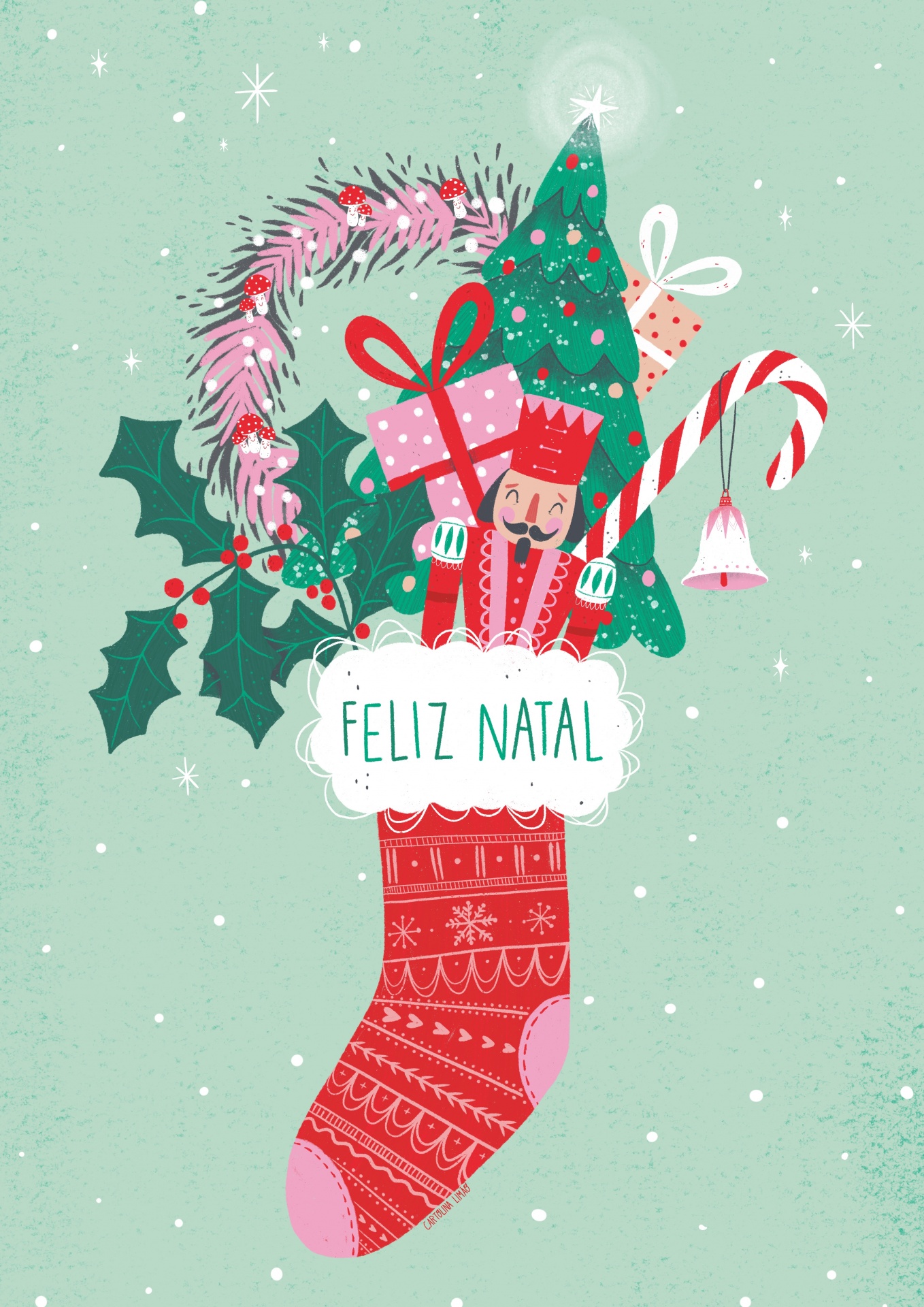 • Meia de Natal vermelha com soldado, árvore, presentes e texto 'FELIZ NATAL'