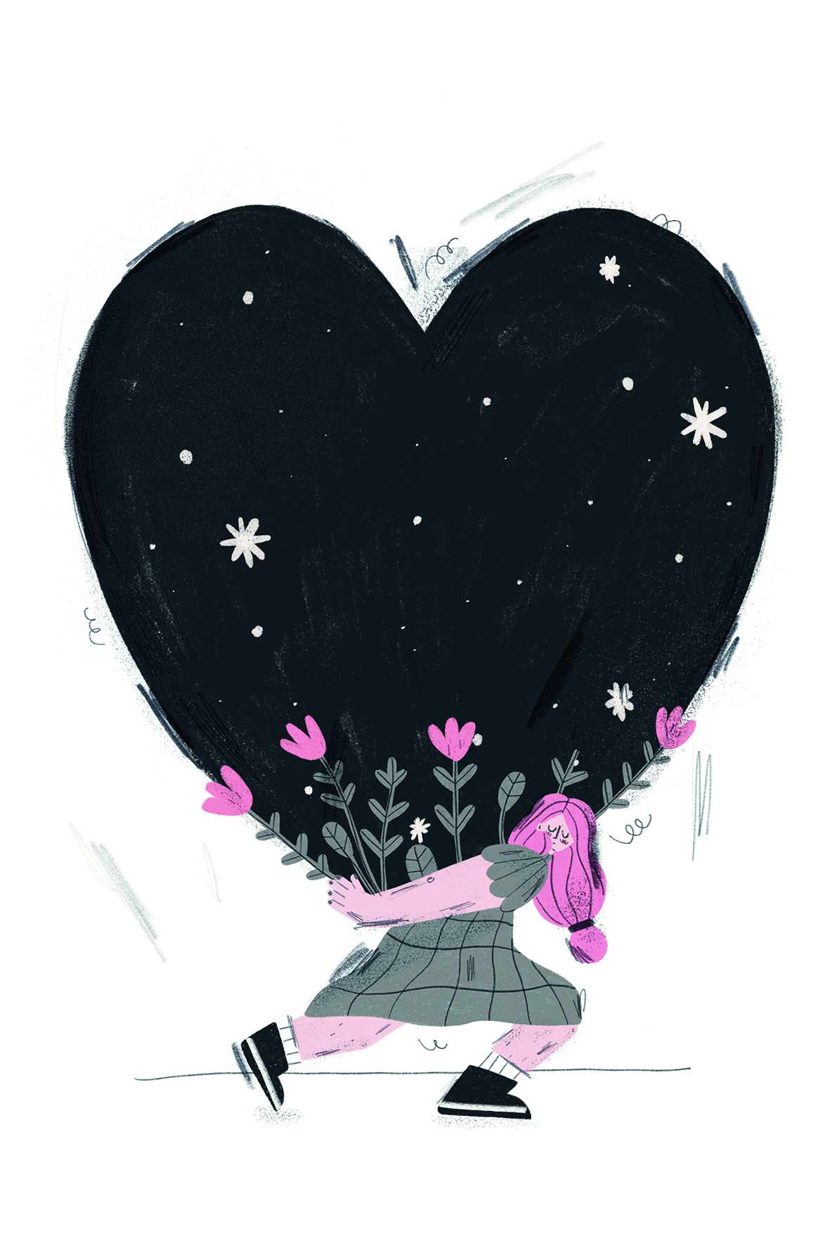 Ilustração de mulher carregando coração preto com flores e estrelas