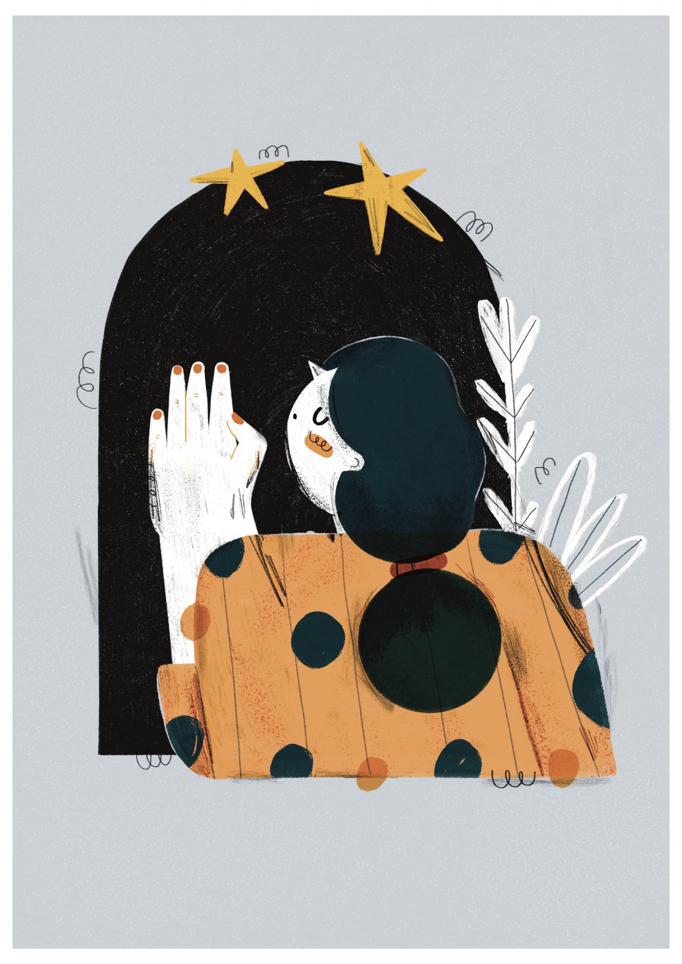 • Ilustração colorida de figura humana com camisa de pontos e elementos abstratos.