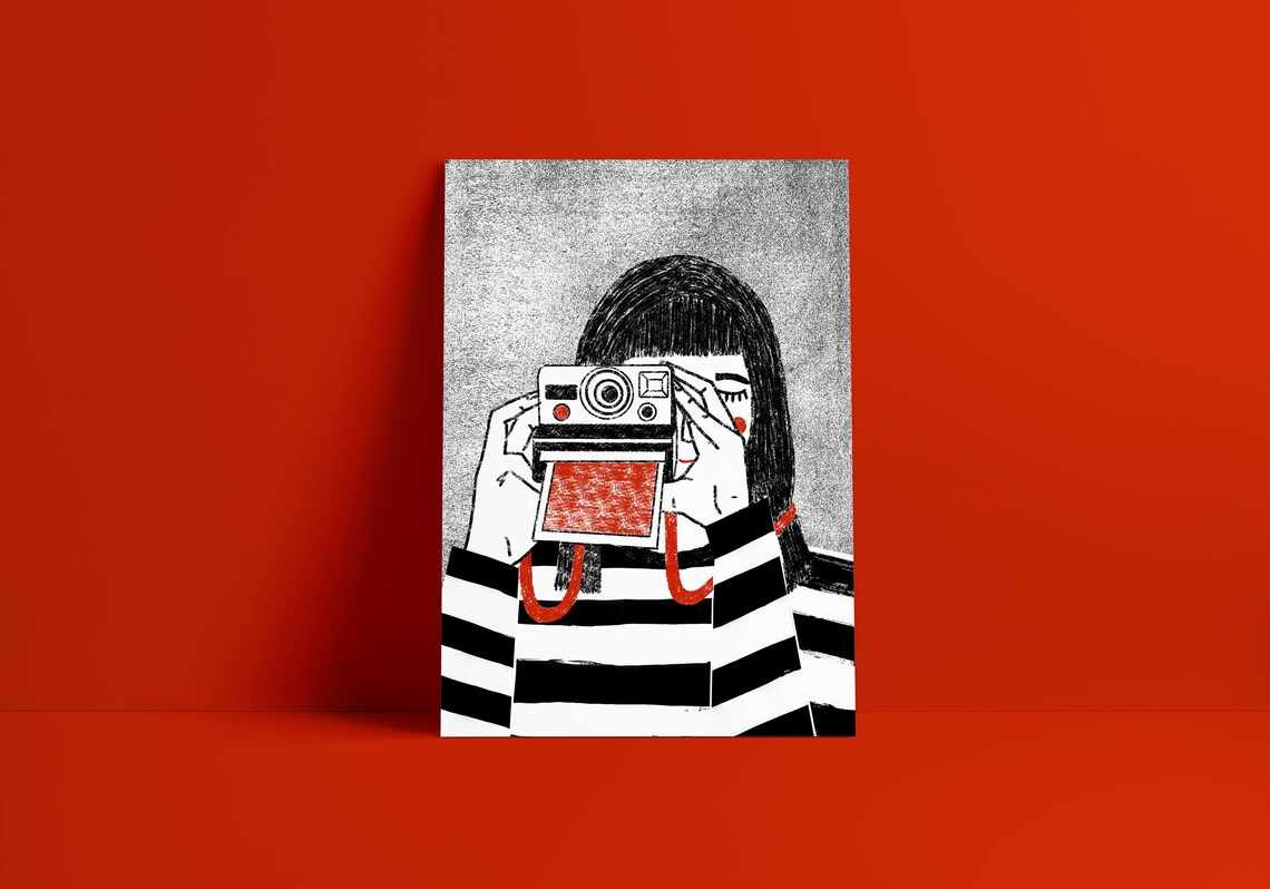 Ilustração de pessoa a tirar foto com máquina fotográfica retro num quadro contra parede vermelha