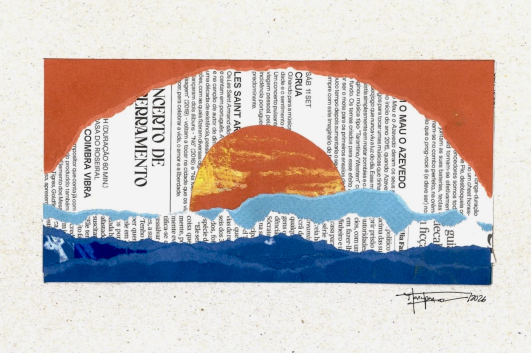 • Colagem artística com recortes de jornal formando sol e mar coloridos