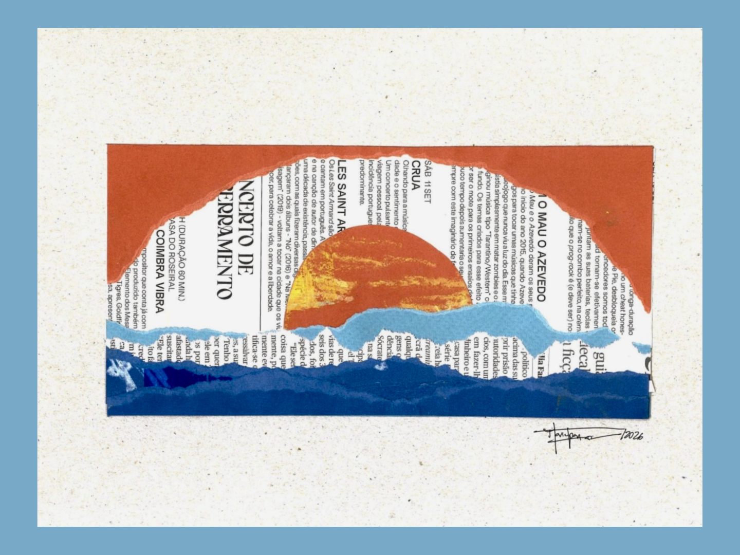 Obra em técnica mista que articula cor, recorte e texto numa composição abstrata inspirada na paisagem do mar ao pôr do sol.