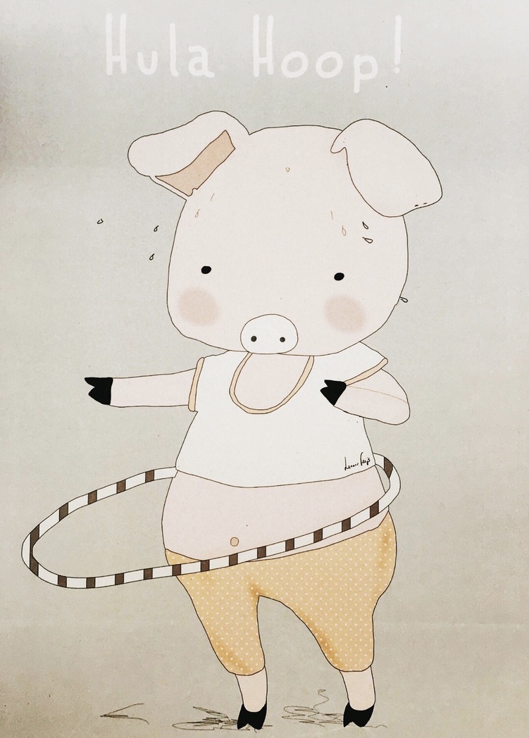• Desenho de um porquinho com hula hoop em fundo bege claro