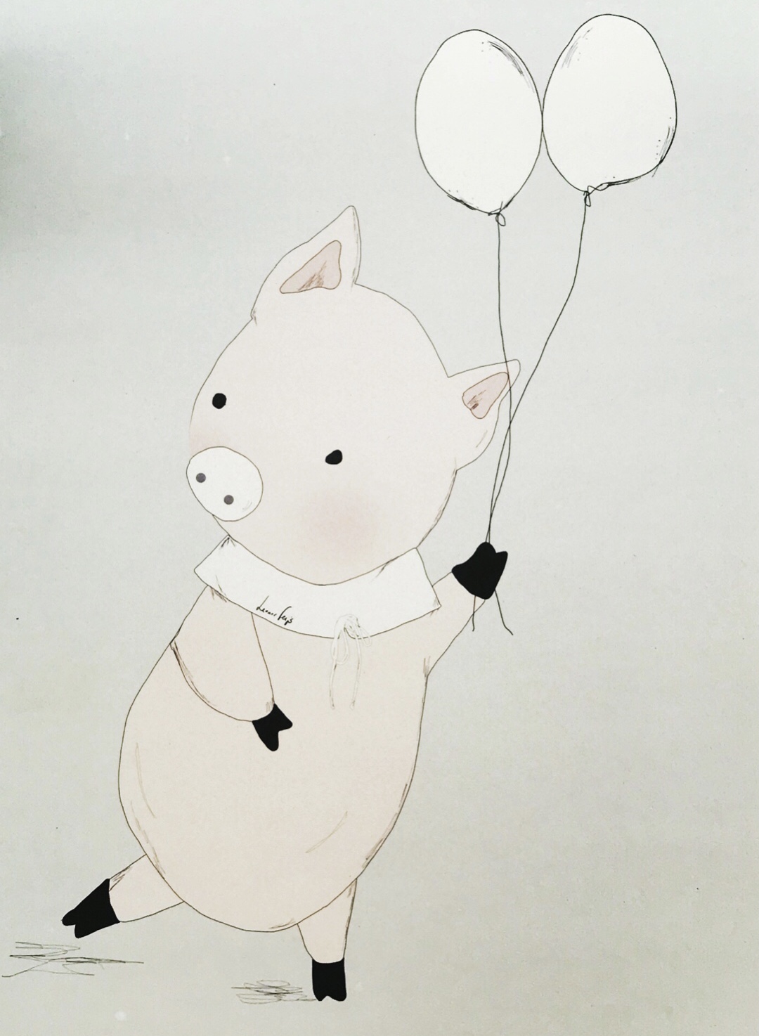 • Desenho de porco segurando dois balões brancos sobre fundo cinza