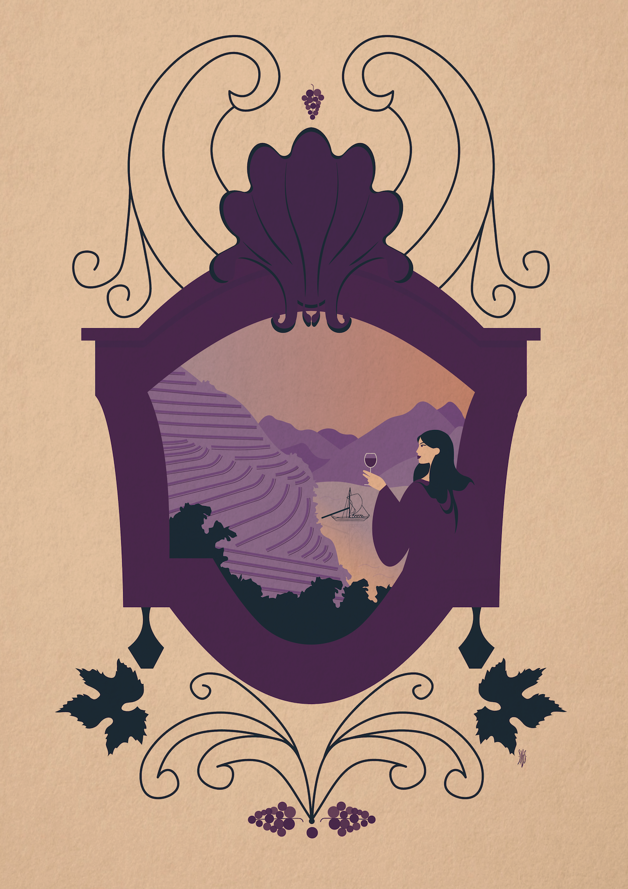 Ilustração decorativa com moldura roxa, uvas, folhas e pessoa a beber vinho em vinhas.
