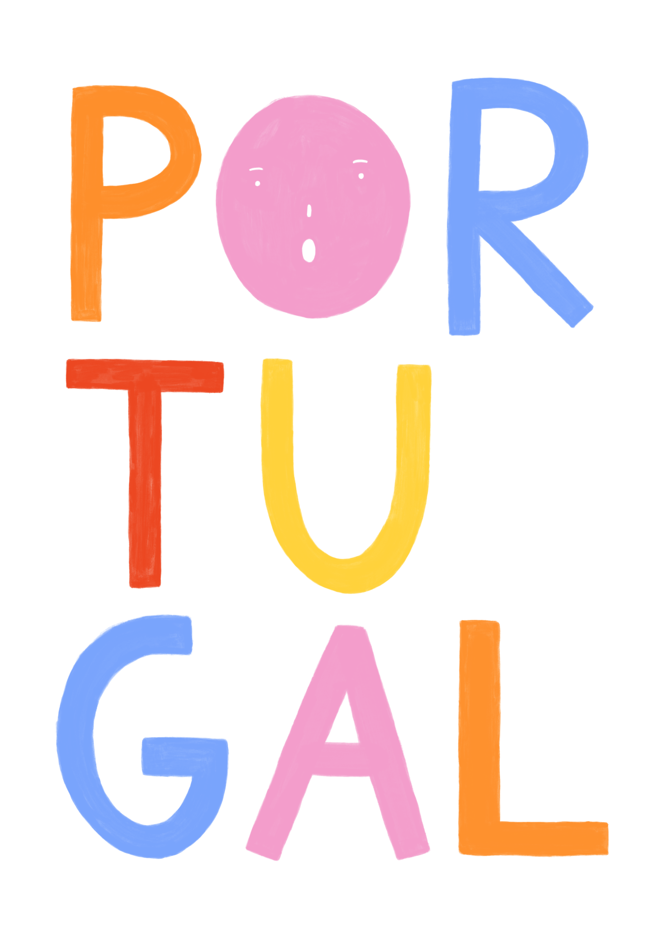 • Pôster colorido com a palavra PORTUGAL e um rosto estilizado na letra O, fundo azul claro