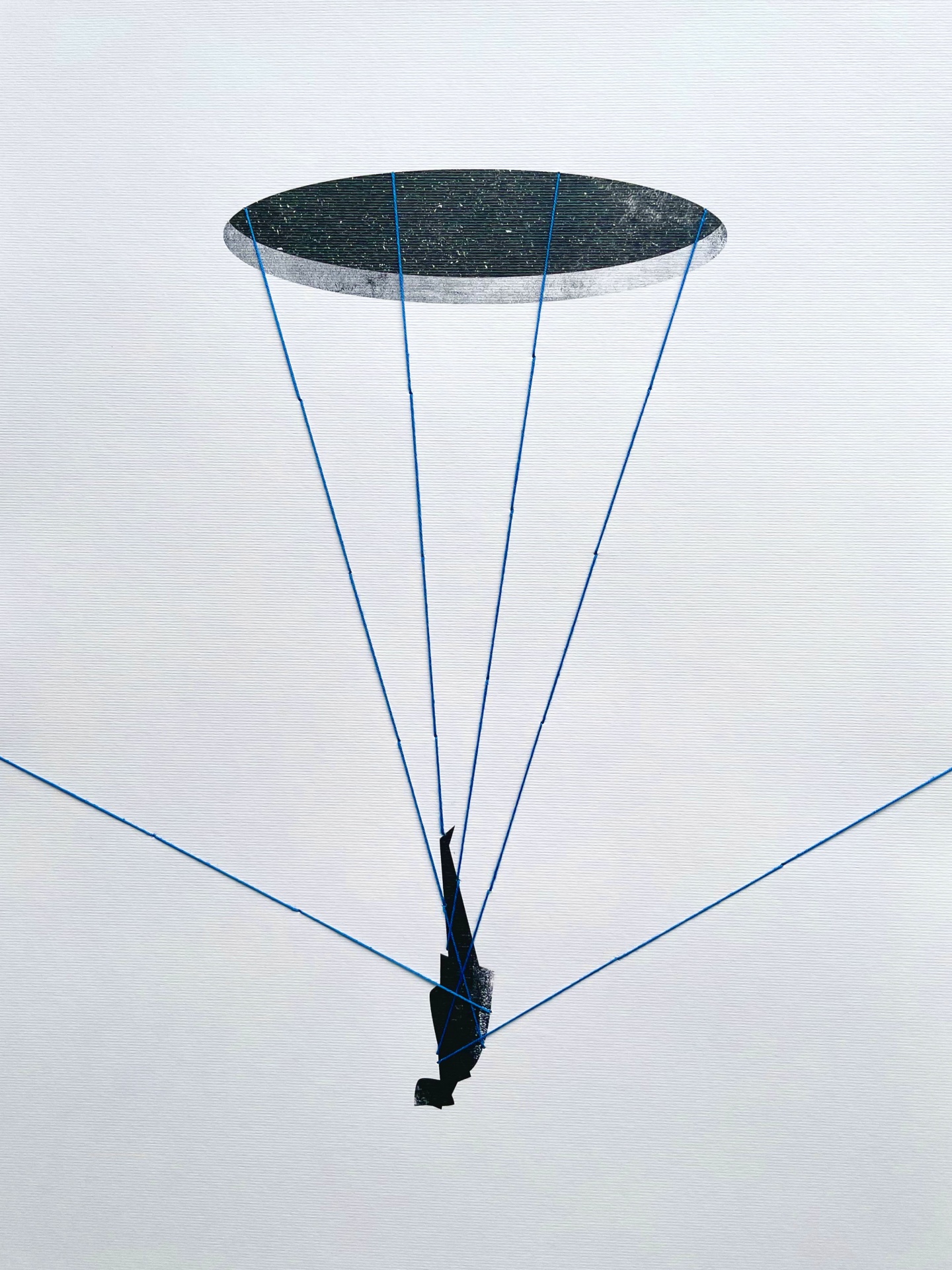 • Silhueta pendurada numa rede circular preta com cordas azuis em fundo branco.