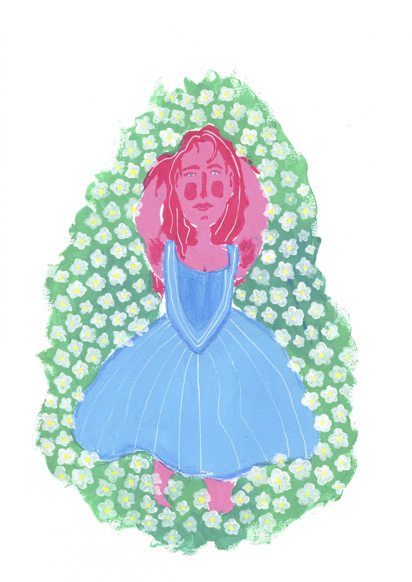 • Ilustração colorida de mulher com vestido azul rodeada de flores brancas