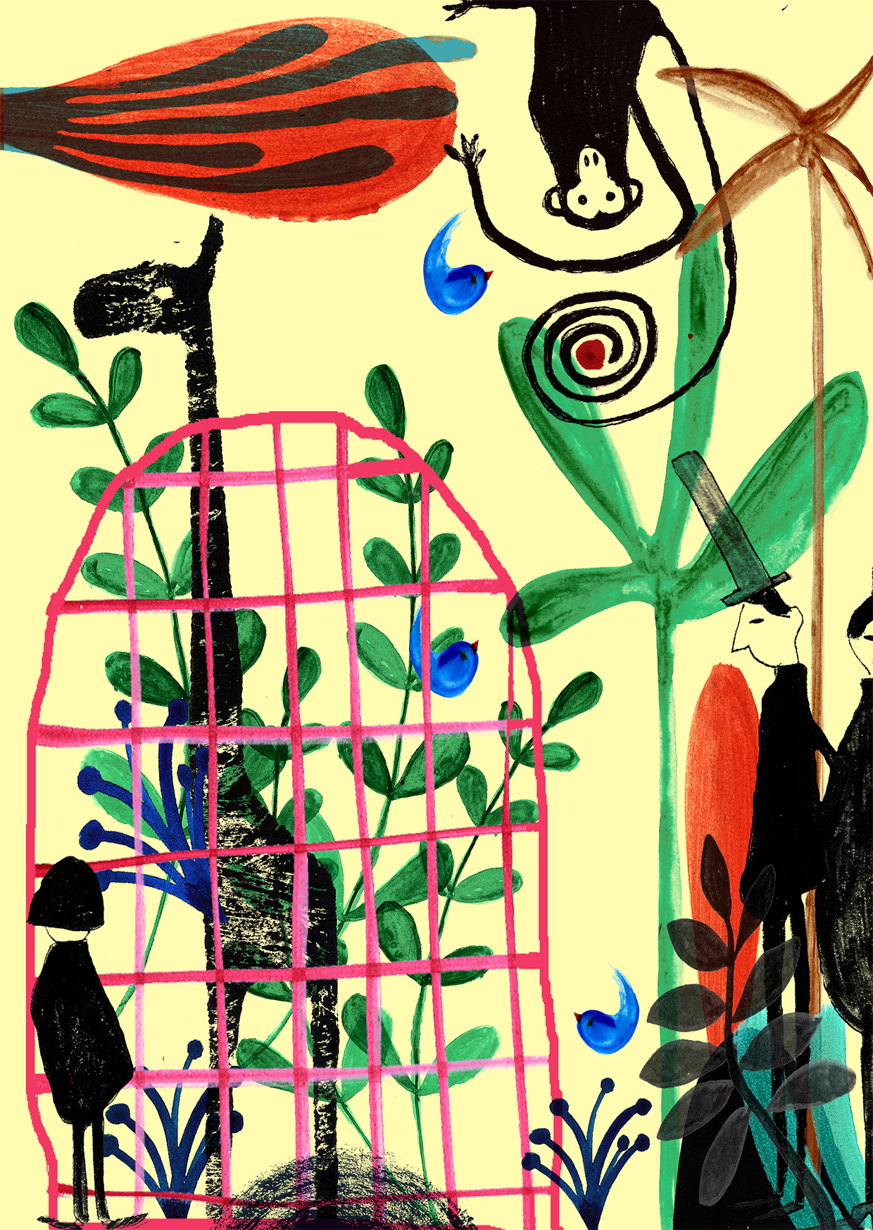 • Ilustração artística com girafa dentro de gaiola rosa, macaco pendurado, árvores verdes e figuras humanas pretas.