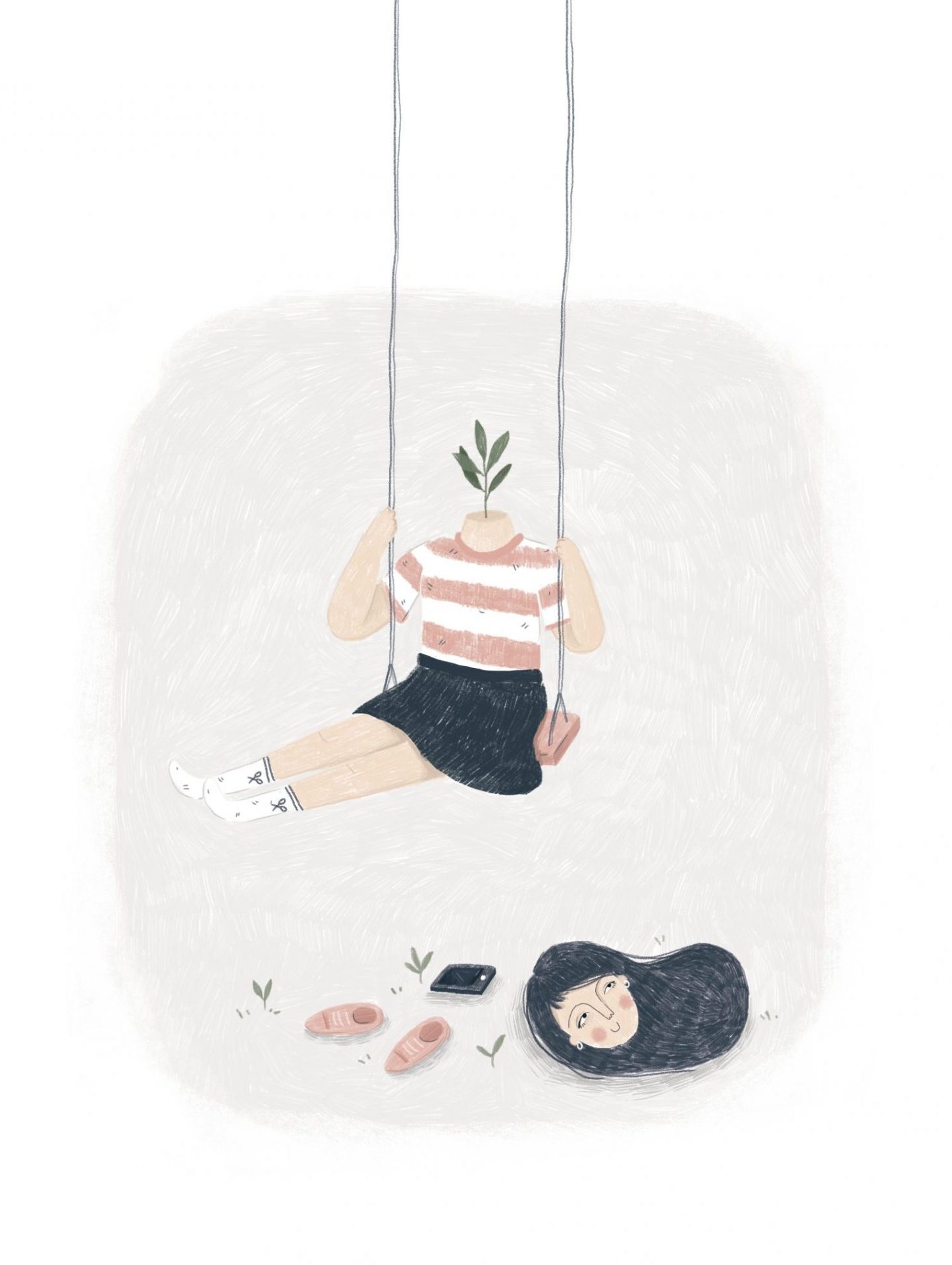 Ilustração de pessoa sem cabeça a balançar em baloiço com planta no lugar da cabeça, e cabeça no chão junto a chinelos e telemóvel.