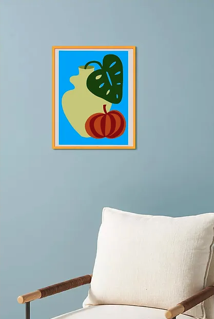 • Vaso verde claro com folha verde escura e abóbora laranja fundo azul