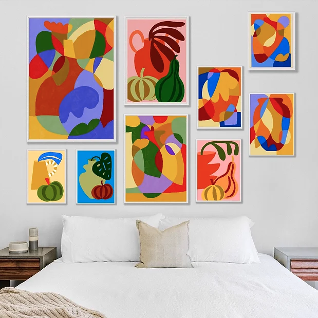 • Conjunto de 9 quadros abstratos coloridos pendurados acima de cama branca