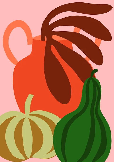 • Ilustração de jarra laranja com folhas marrons e dois vegetais verde e bege