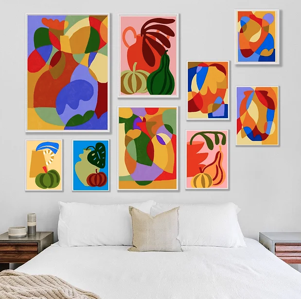 • Conjunto de quadros coloridos abstratos em parede de quarto