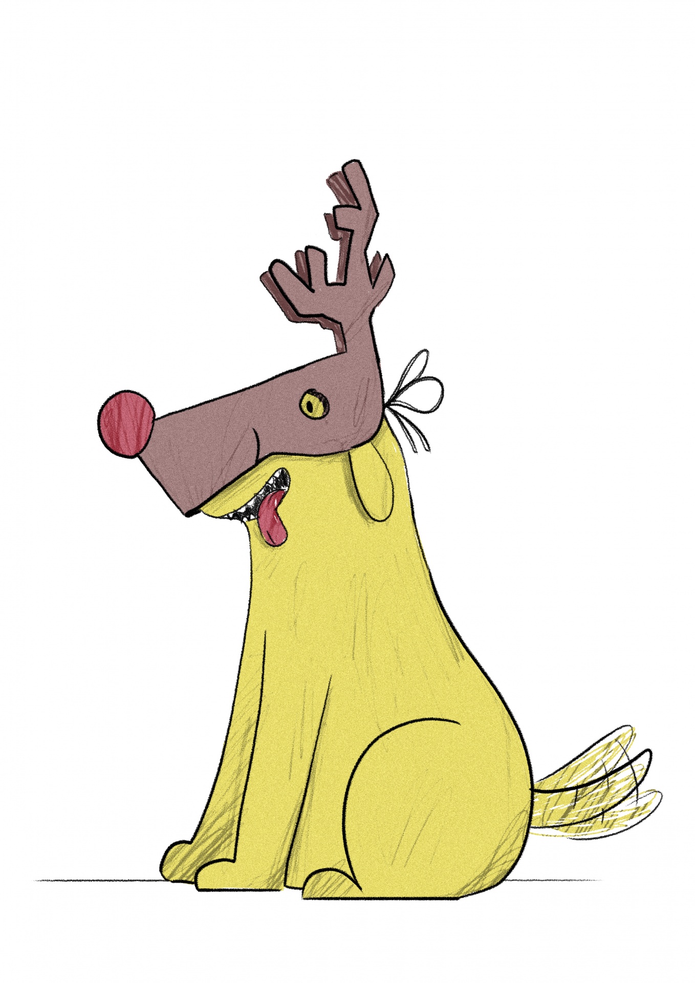 • Cão amarelo sentado com máscara de rena castanha e nariz vermelho