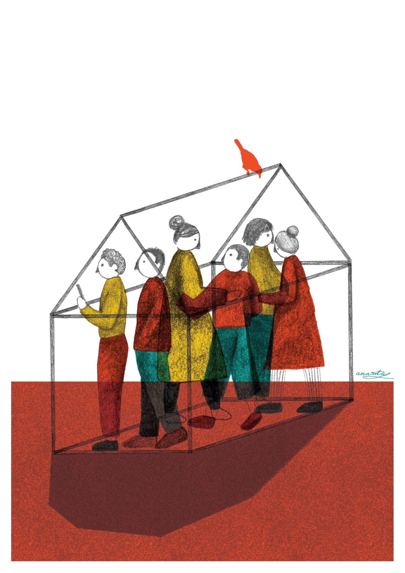 Ilustração de seis figuras dentro da estrutura de uma casa com um pássaro no telhado
