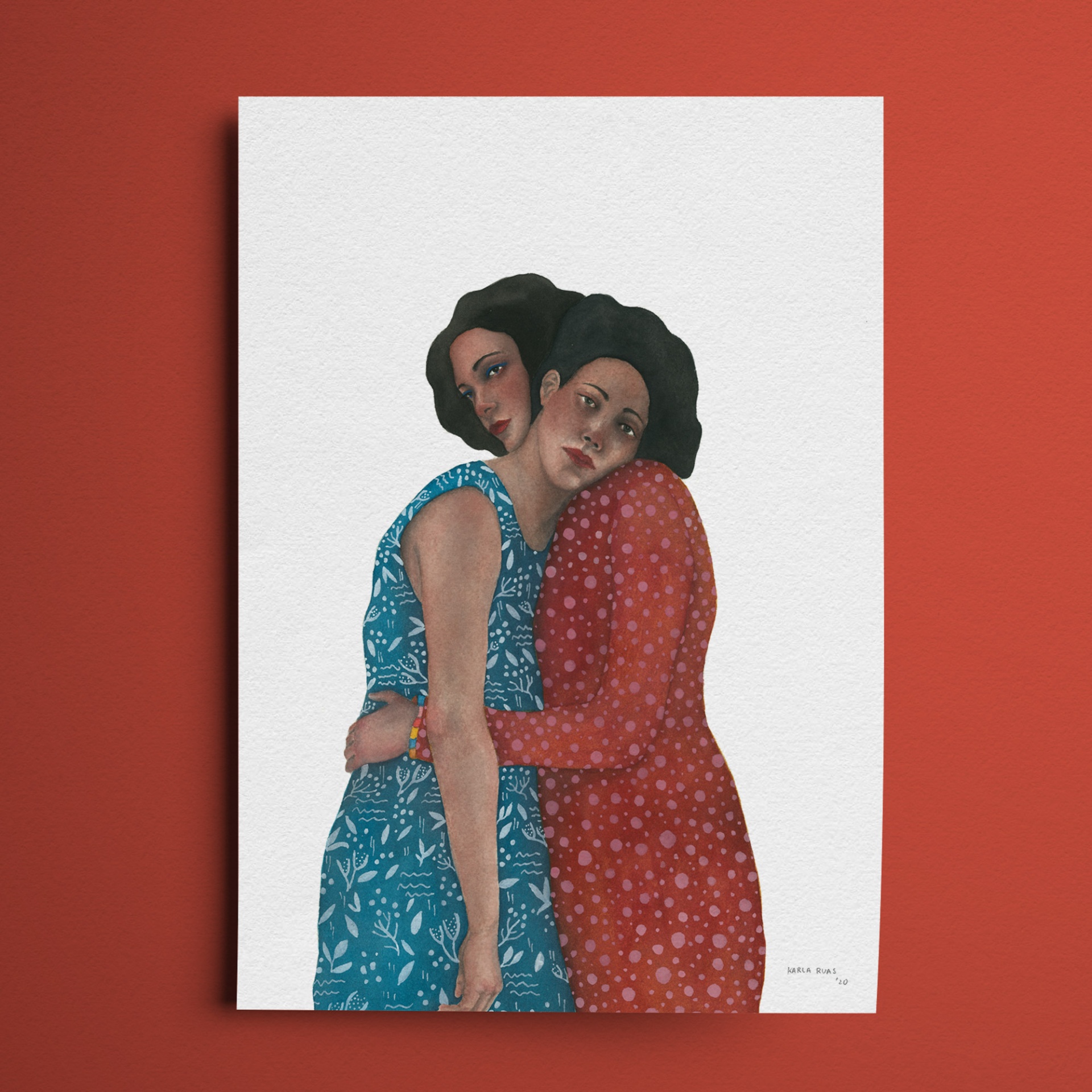 Quadro de ilustração de duas mulheres abraçadas com vestidos azul e vermelho, moldura de madeira, junto a vaso com ramos secos