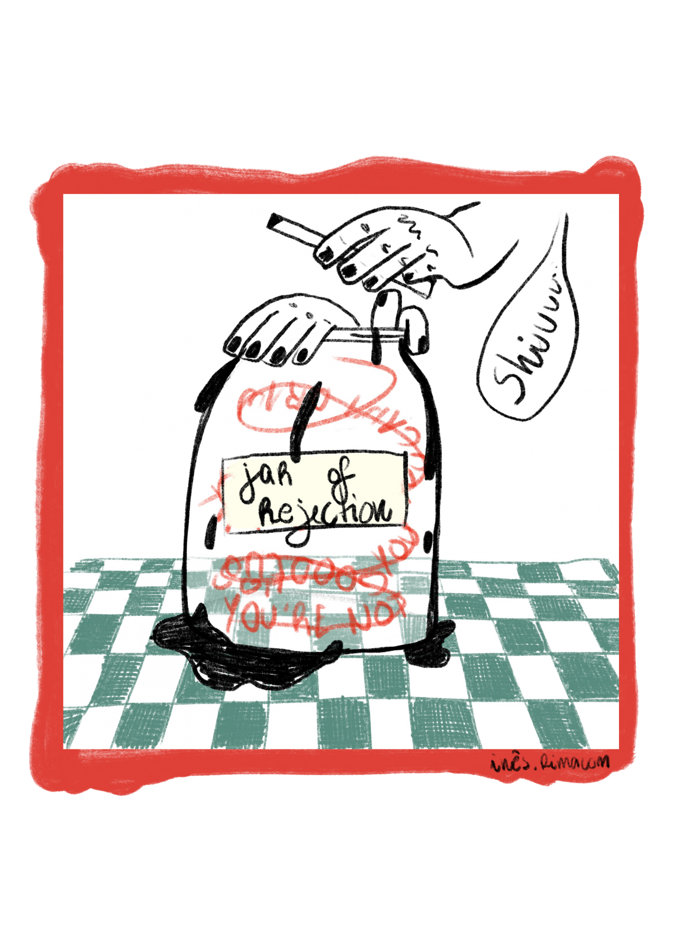 Desenho de um frasco com rótulo 'jar of rejection' numa mesa xadrez verde e branco com mãos a fechar a tampa e palavra 'Shivuu' num balão de fala