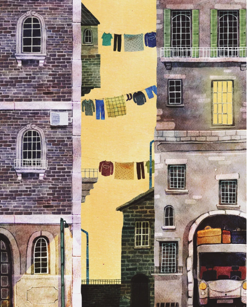 • Rua com prédios, roupas penduradas e camião branco estacionado