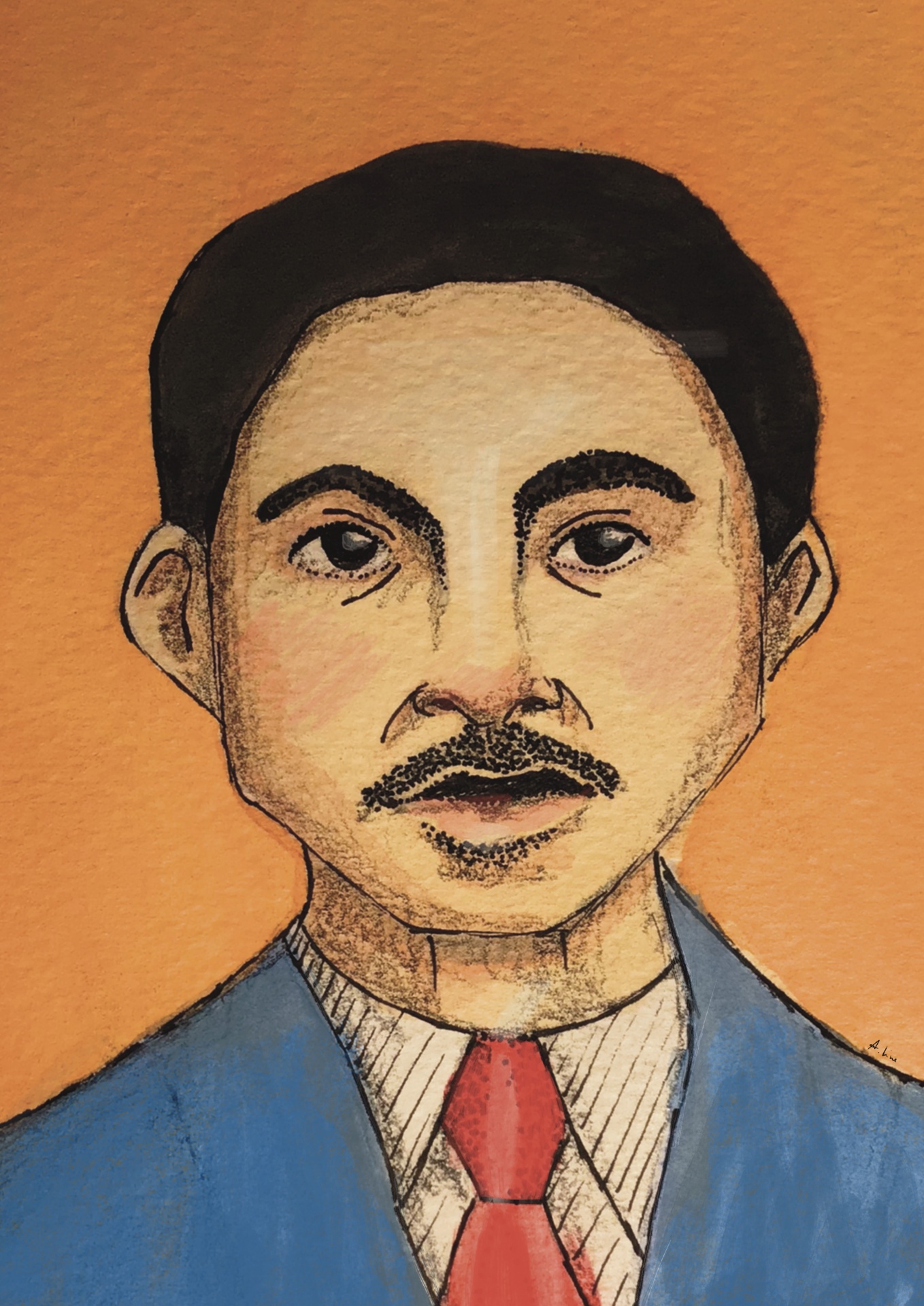 • Ilustração de homem de fato azul e gravata vermelha com fundo laranja