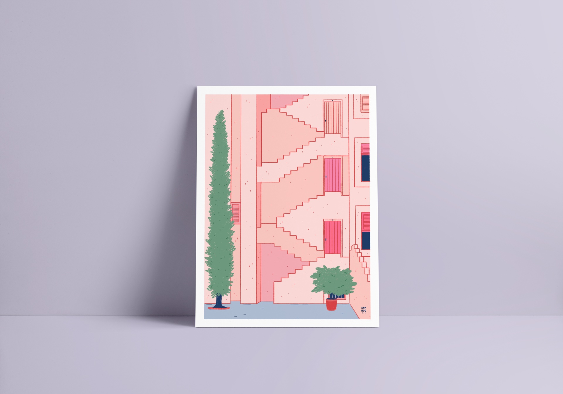 • Póster ilustrativo de escadas cor-de-rosa com plantas verdes