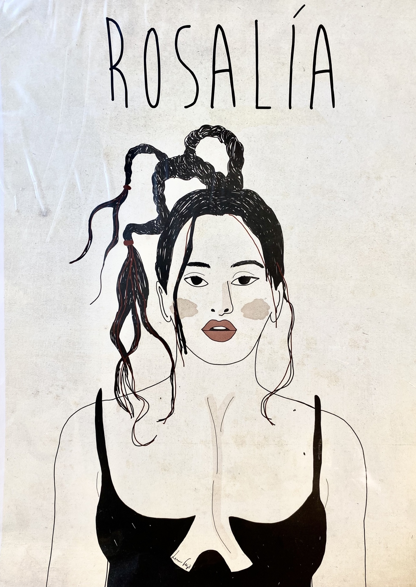 • Ilustração de mulher com cabelo apanhado e top preto, texto ROSALÍA acima.
