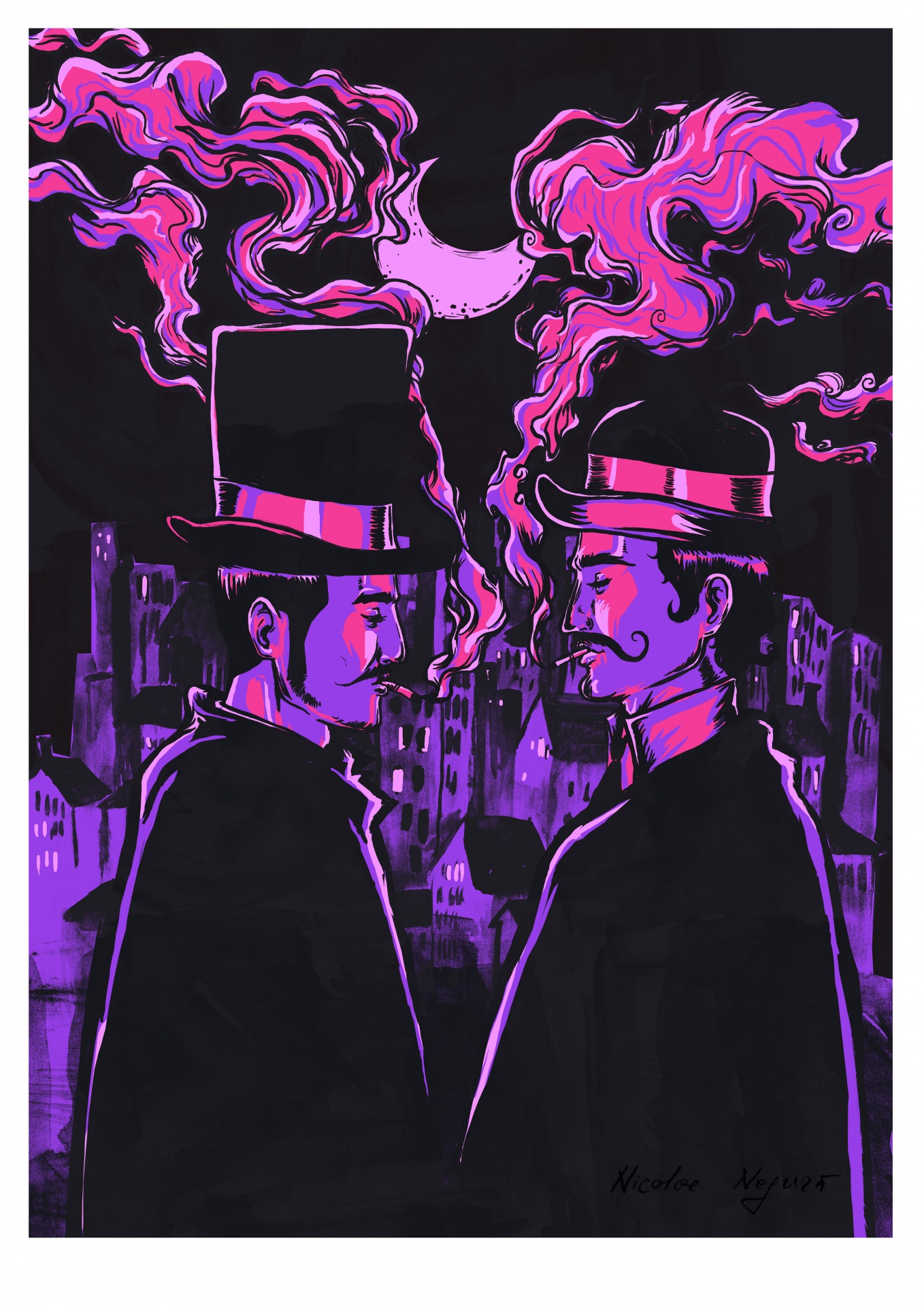 • Ilustração de duas figuras masculinas com cartolas e fumaça, cidade ao fundo à noite