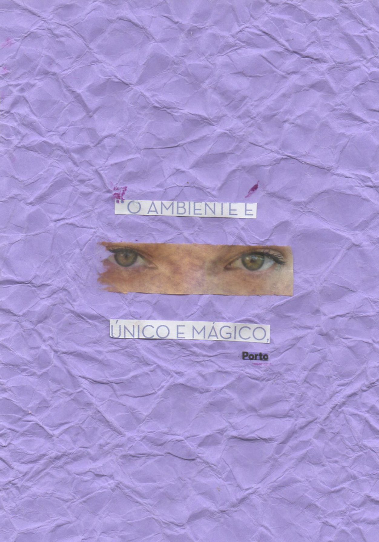 • Fundo lilás amassado com olhos humanos recortados e textos colados.
