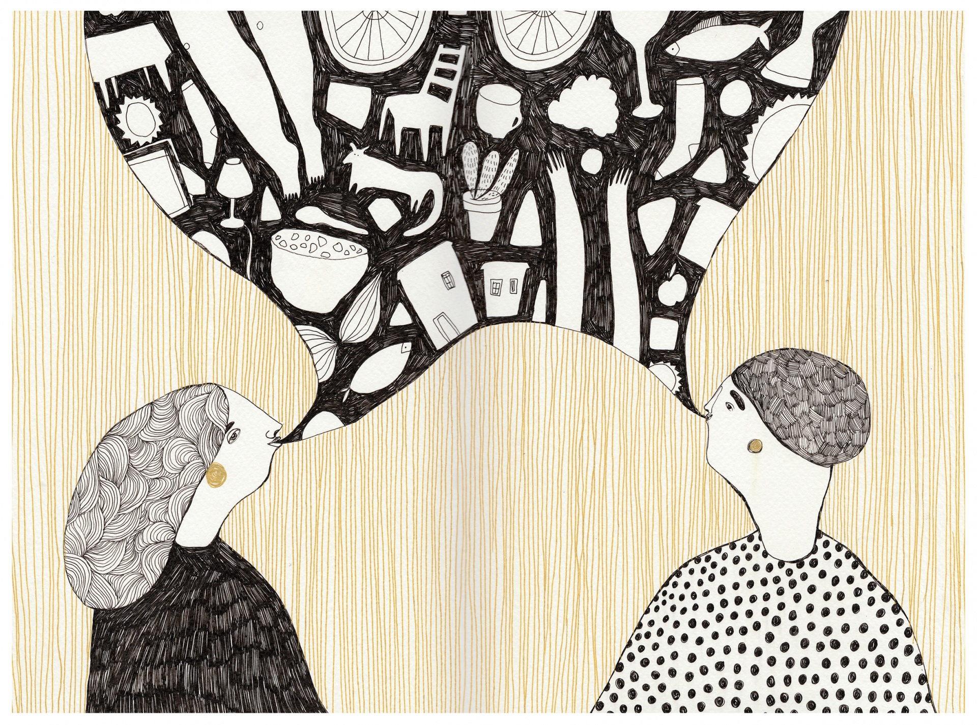 • Desenho artístico a preto e branco de duas pessoas estilizadas com balões de fala contendo objetos diversos.
