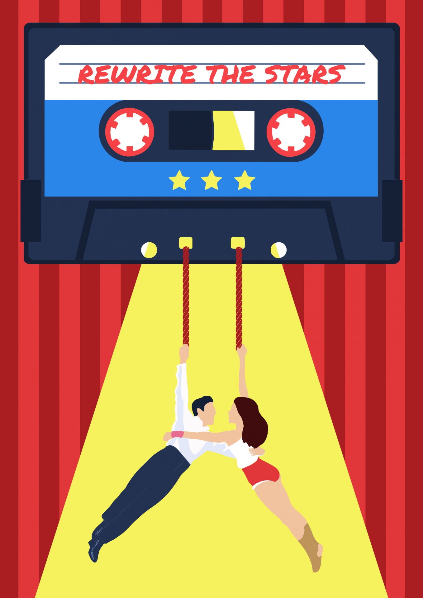 • Cassete azul e preto com texto REWRITE THE STARS e duas pessoas penduradas em cordas sob luz amarela