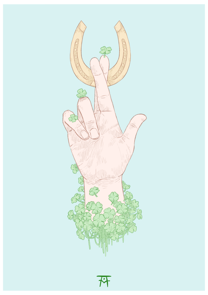 • Mão com trevos segurando ferradura dourada em fundo azul claro