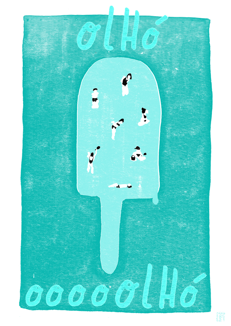 Ilustração de gelado em pau azul com figuras humanas e texto 'olhó' e 'oooooólhó'.