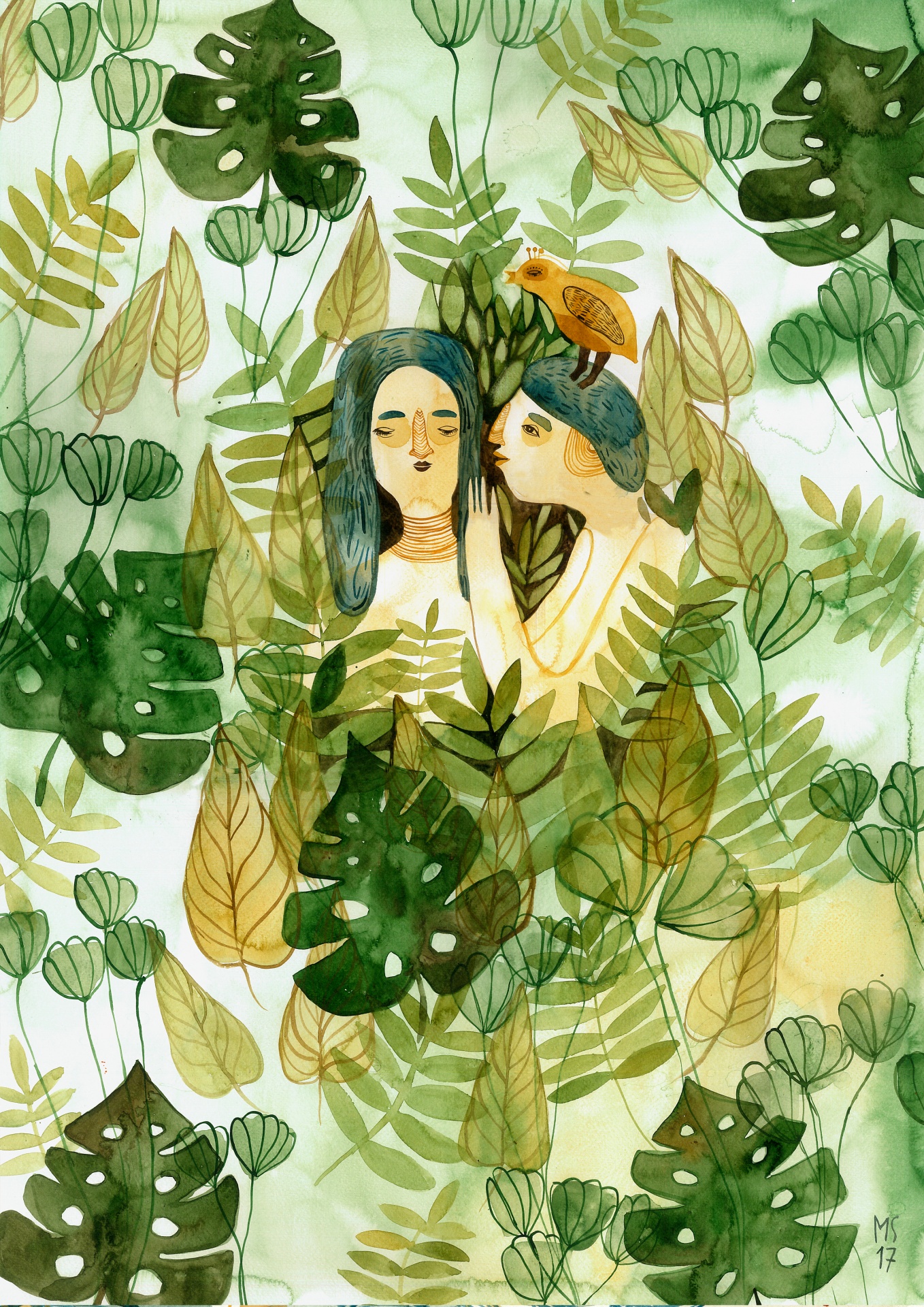• Ilustração em verde e amarelo com folhas e duas figuras femininas estilizadas, uma com pássaro laranja na cabeça