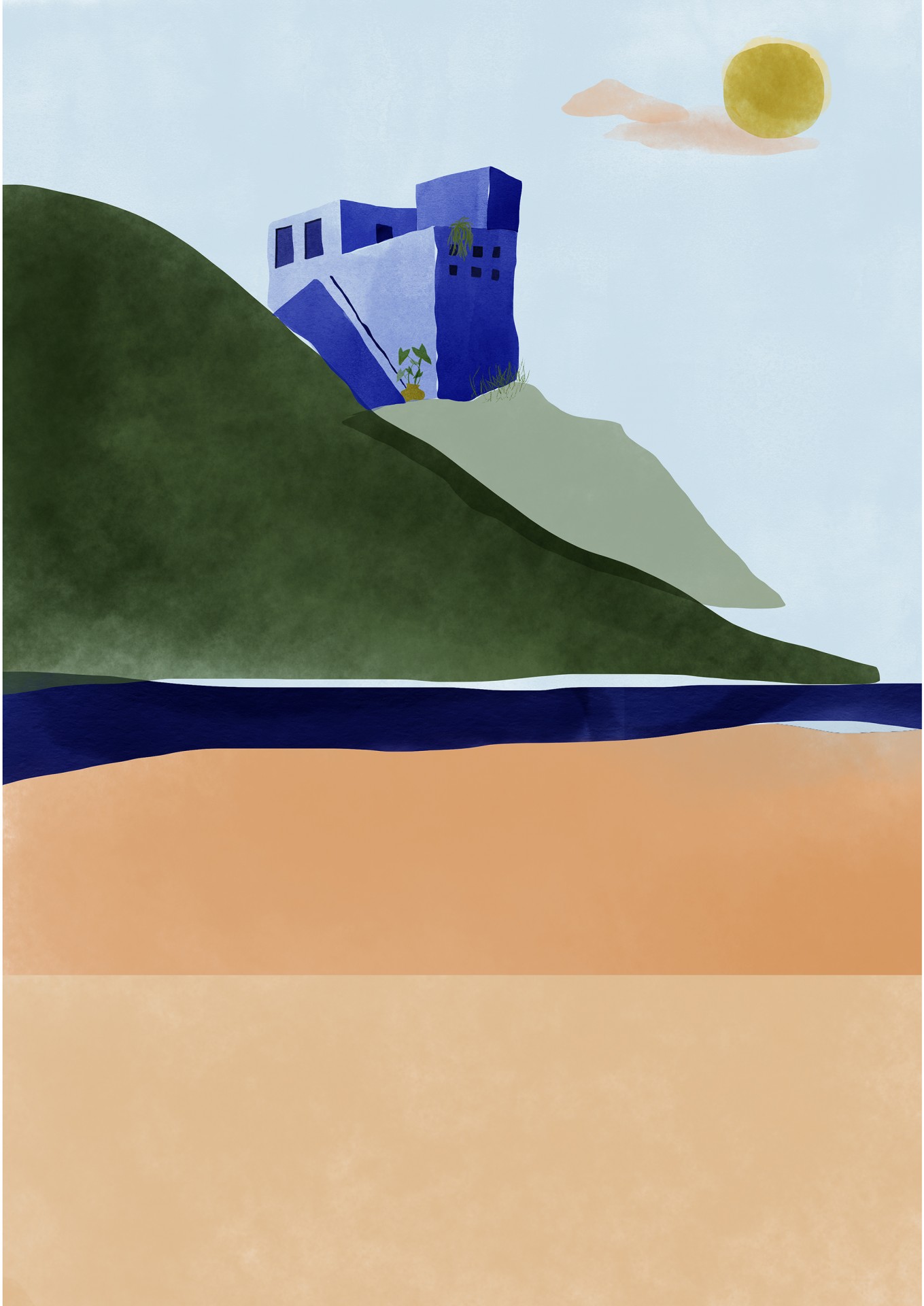 • Ilustração abstrata de casa azul na colina com praia e sol