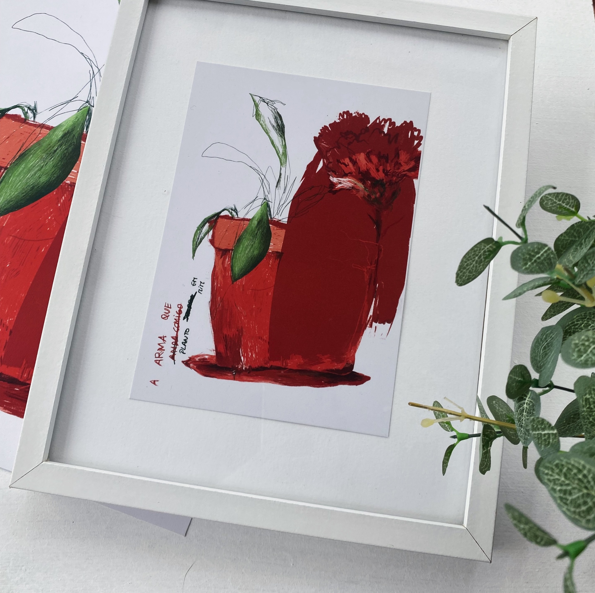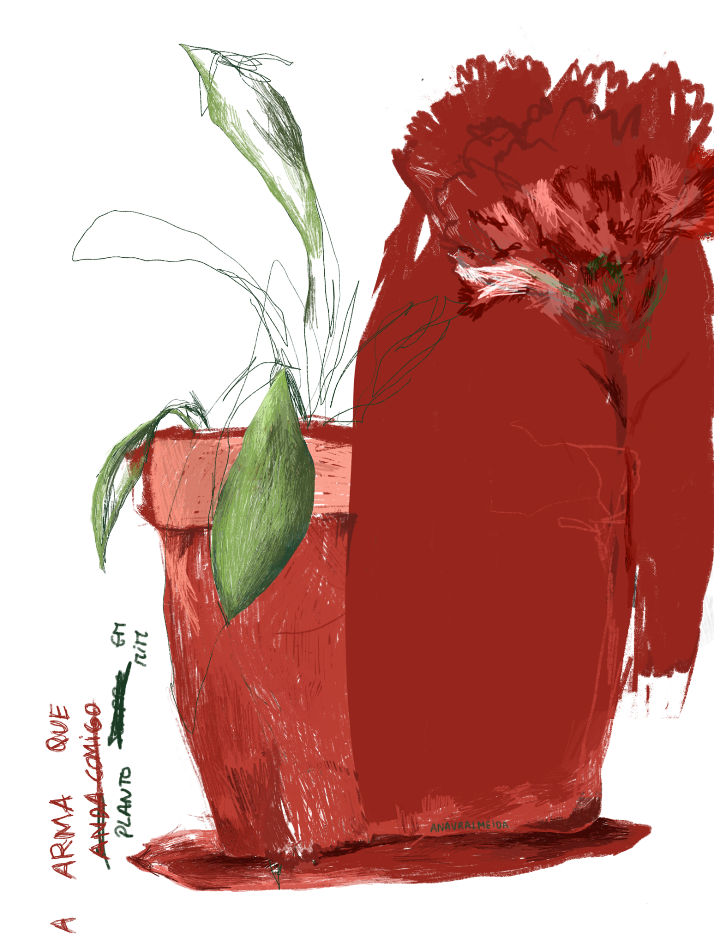 • Vaso de terracota com planta e flor vermelha, texto manuscrito em português