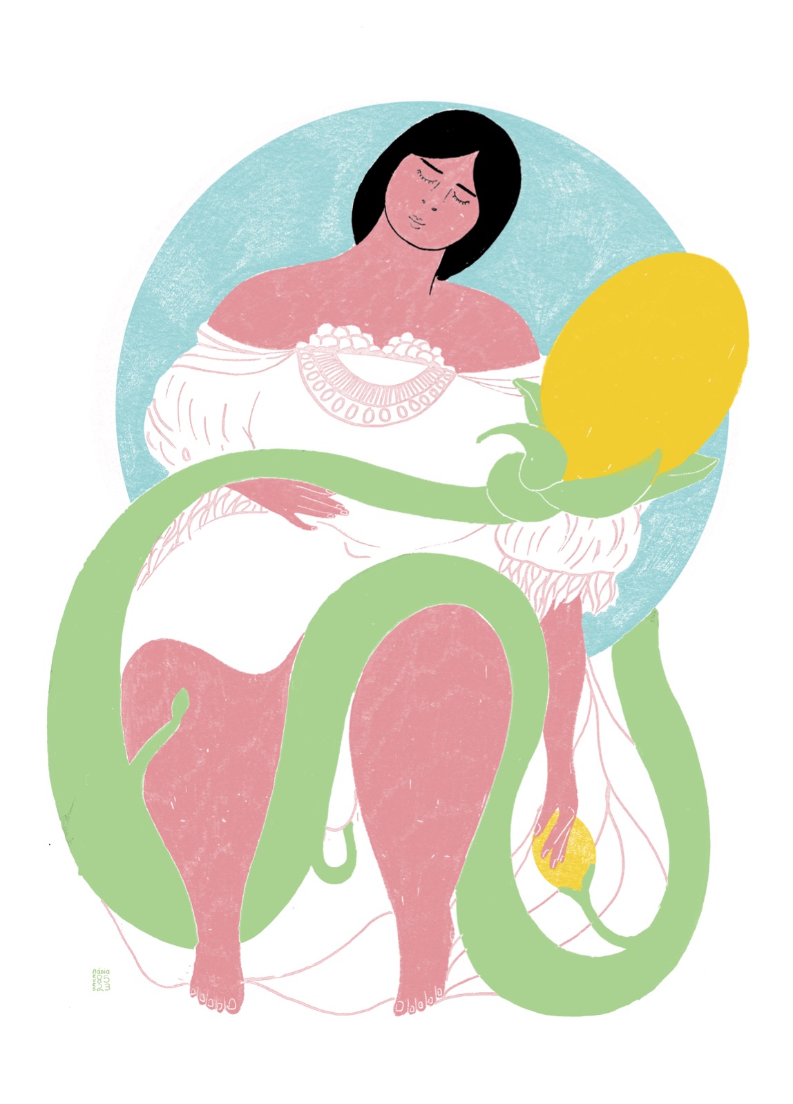 • Ilustração de mulher com túnica branca segurando objecto amarelo com verde
