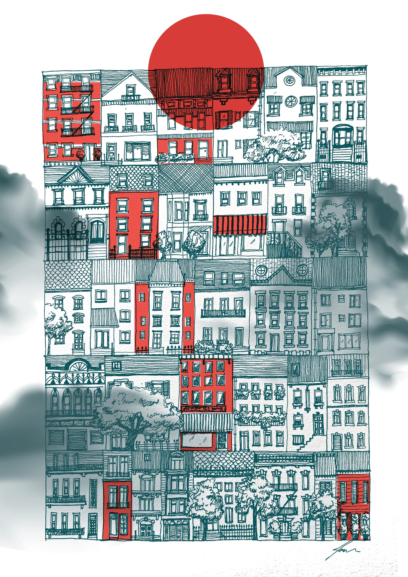 Desenho de fachadas de prédios com detalhes vermelhos e círculo vermelho no topo